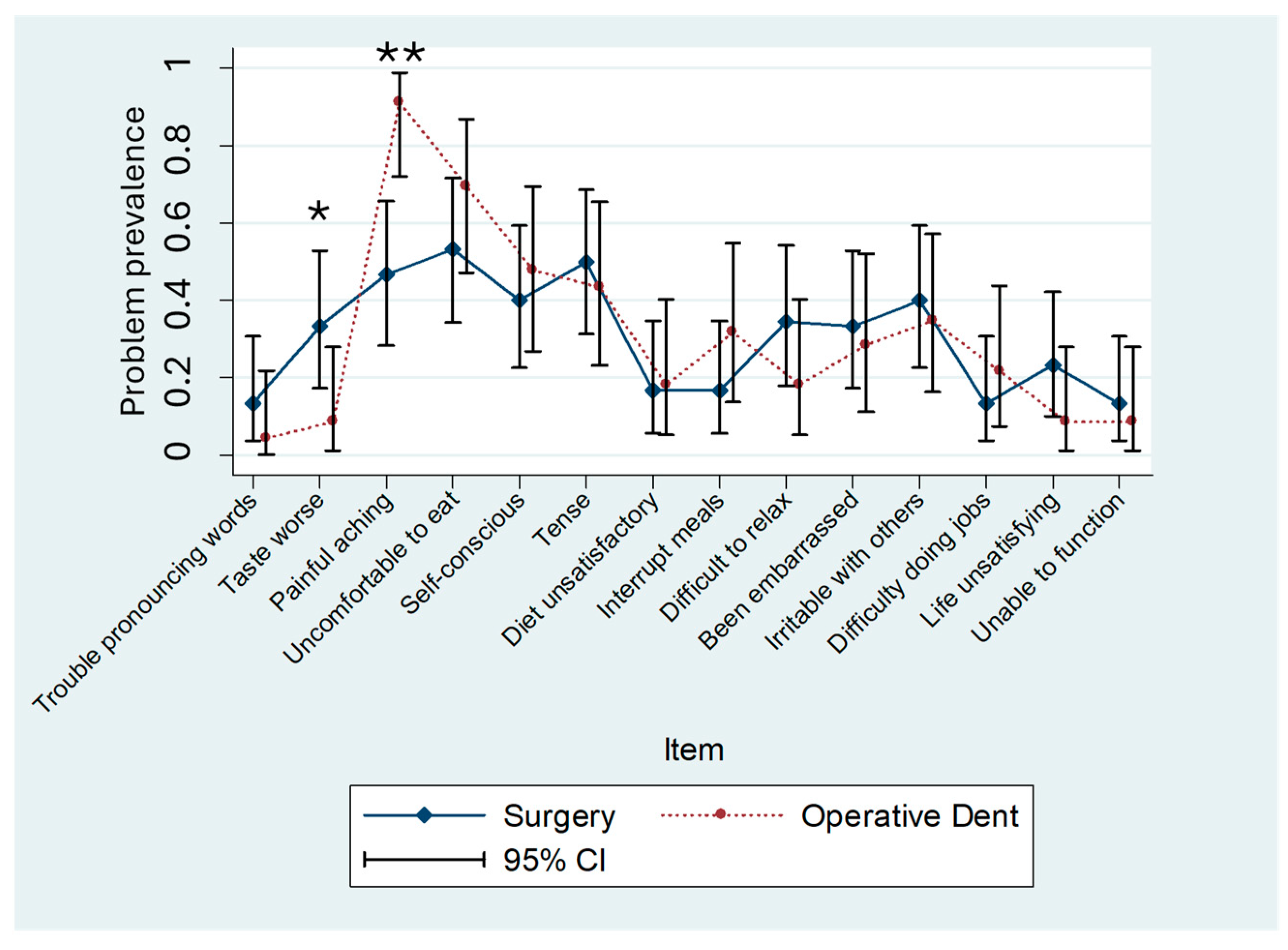Figure 1. OHIP-H14 item prevalence for oral surgery or operative dentistry patients. Prevalence and 95% confidence intervals (CIs) for oral surgery patients (n = 30) and operative dentistry patients (n = 22). Group differences indicated with asterisks (* item number 2, “Taste worse,” p = 0.03, and ** item number 3, “Painful aching,” p < 0.001).