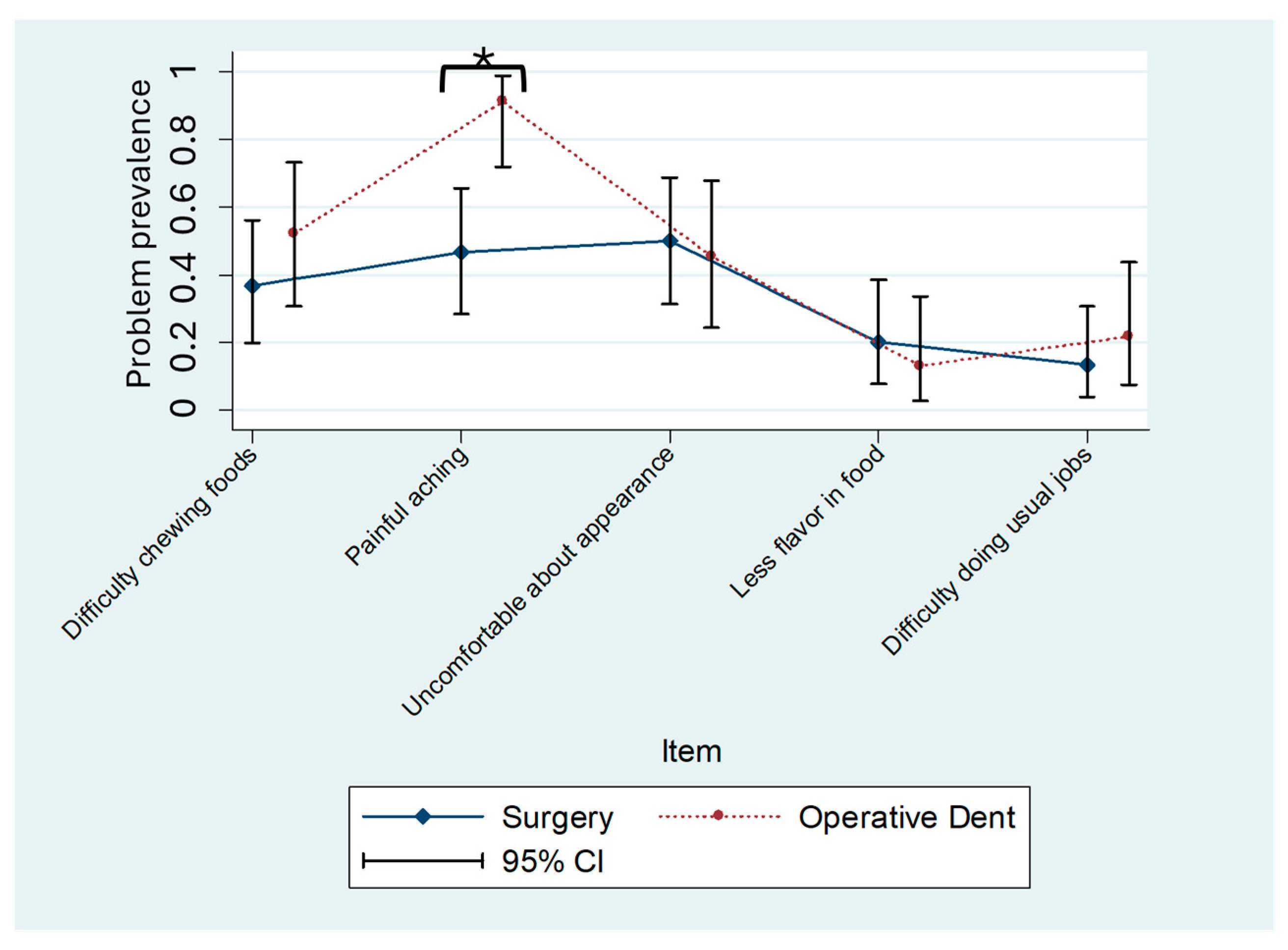 Figure 2. OHIP-H5 item prevalence for oral surgery or operative dentistry patients. Prevalence and 95% confidence intervals (CIs) for oral surgery patients (n = 30) and operative dentistry patients (n = 22). Group differences indicated with asterisk (* item number 2, “Painful aching,” p = 0.005).