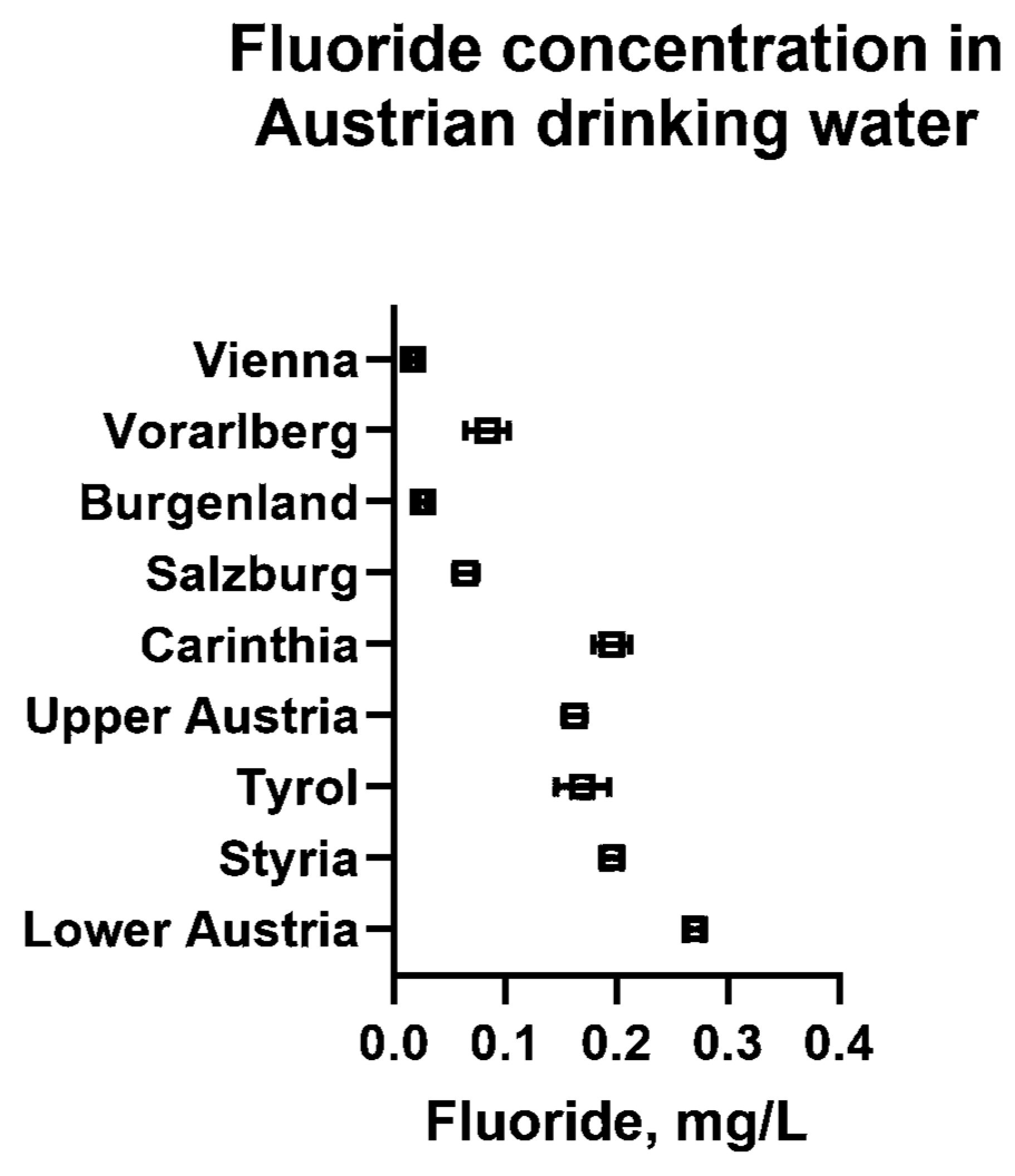 3.2. Fluoride Concentration in Austrian Drinking Water