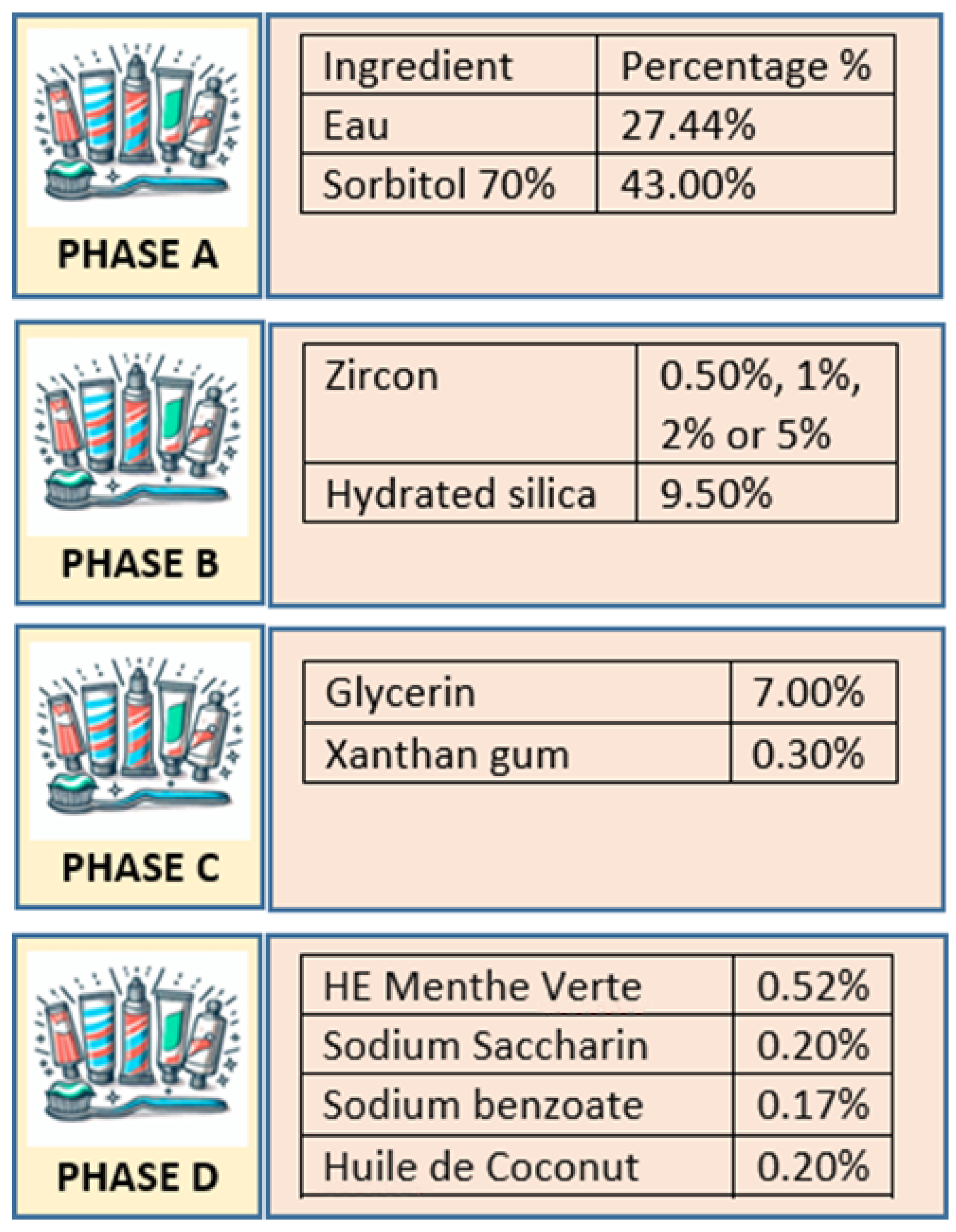 - Phase D: Flavoring (peppermint essential oil), sweetener (sodium saccharin), preservative (sodium benzoate), emollient (coconut oil), and foaming agent (sodium lauryl sulfate) were added to enhance taste, extend shelf life, improve mouthfeel, and create foaming during brushing.