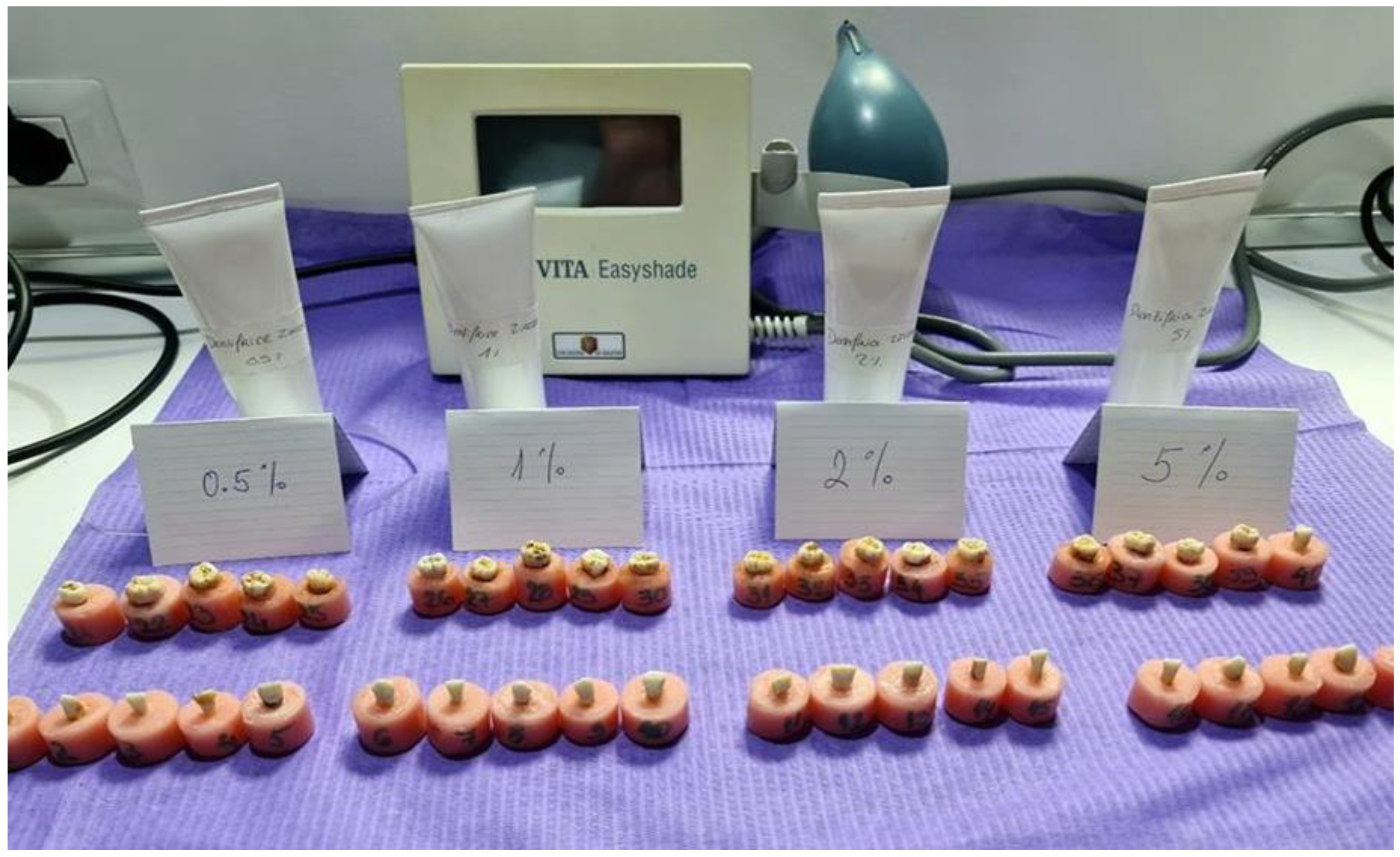 - Casado, B.G.S.; Moraes, S.L.D.; Souza, G.F.M.; Guerra, C.F.M.; Souto-Maior, J.R.; Lemos, C.A.A.; Vasconcelos, B.C.E.; Pellizzer, E.P. Efficacy of dental bleaching with whitening dentifrices: A systematic review. Int. J. Dent. 2018, 2018, 7868531. [Google Scholar] [CrossRef]