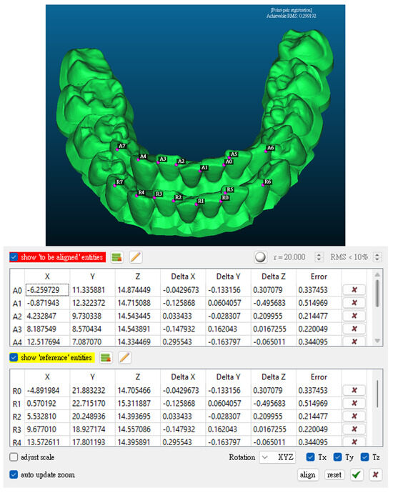 To analyze the thermoforming process, CloudCompare v2.13.0 (www.cloudcompare.org (accessed on 10 September 2025)) was used, which is an open-source 3D point cloud processing software [24]. It can evaluate the impact of various manufacturing processes, including post-curing and both positive- and negative-pressure thermoforming, on the accuracy and precision of digital dental models [25]. Point-to-point alignment was conducted using the Iterative Closest Point (ICP) algorithm, aligning the scanned post-processed models with the original STL design file. The ICP algorithm operates by identifying nearest-neighbor point pairs, calculating an optimal rigid body transformation (rotation and translation), and iteratively minimizing the distance until convergence or a predefined threshold is reached [26].
