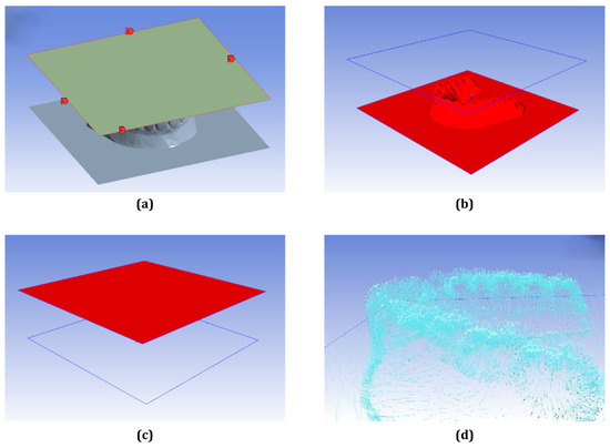 Polyflow simulation setup process: (a) pressure boundary assignment at PETG sheet edge, (b) mold geometry positioned beneath the thermoplastic sheet, (c) initial sheet and mold alignment before deformation, (d) deformation vector field visualizing material flow during forming.