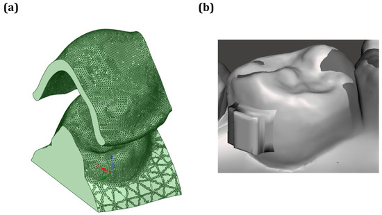 (a) Digital model of the aligner and dentition, and (b) contact model between the aligner and dentition for simulation analysis.