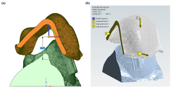 From Figure 4a, it can be seen that a localized simulation was carried out on a single premolar in order to strike a balance between the computational efficiency and the anatomical fidelity of the numerical simulation. The mandibular premolars were selected for testing as they serve as anchorage or movement teeth commonly used for aligner therapy. They have a relatively simple single-root morphology that facilitates finite element modeling [30,31]. The clinical treatment planning characteristics were used to determine the target tooth movement, which predominantly consisted of mesial translation in conjunction with rotation in the opposite direction of the standard clockwise direction (Figure 4b).