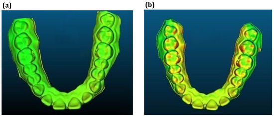 Once aligned, the cloud-to-mesh distance function in CloudCompare was used to calculate the shortest distance from each point on the scanned model to the corresponding reference mesh. This allowed for a quantitative assessment of geometric deviations introduced during post-processing and thermoforming. Figure 1 shows a direct comparison between the original design (model A) and the scanned thermoformed model (model B). The results were visualized as color-coded deviation maps, as shown in Figure 2. The red zones indicate regions of maximum deviation; that is, typically concentrated around the cusp tips and incisal edges. In contrast, yellow and green areas represent regions with lower deformation levels. These visualizations enabled a direct comparison of dimensional accuracy under positive- and negative-pressure thermoforming conditions and highlighted critical regions where surface precision is most affected. Deviation analysis was performed using a triangulated mesh with an average facet size of ~0.05 mm, consistent with the scanner’s native resolution, ensuring that discretization errors remained well below the observed deviations.