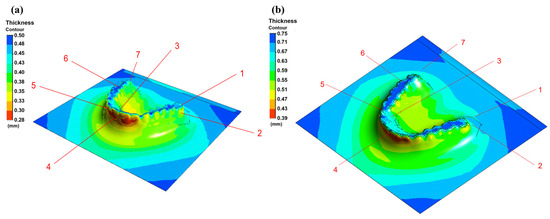 Simulated thickness distribution of (a) 0.5 mm and (b) 0.75 mm PETG sheet during thermoforming (numbers represent the zones for thickness measurements).