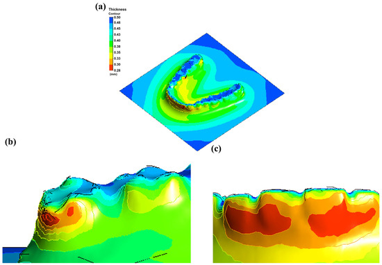 Thermoforming simulation results for 0.5 mm PETG sheet: (a) overall thickness distribution, (b) wisdom tooth region, (c) incisor region.