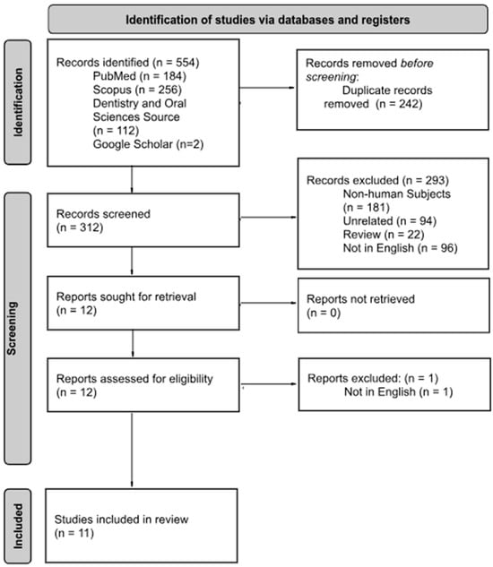 From the database search, a total of 552 articles were initially identified. Additionally, a search of Google Scholar was used to include two additional in vivo studies that fit the inclusion criteria making the total articles 554. Prior to screening, 242 duplicates were removed. The remaining 312 articles were screened by the four independent reviewers using the aforementioned inclusion and exclusion criteria. After the initial screening, twelve articles were selected for data extraction. During data extraction, one additional article was excluded due to it not being published in English. The final review included eleven studies, nine from the database search and two selected from Google Scholar (Figure 1).