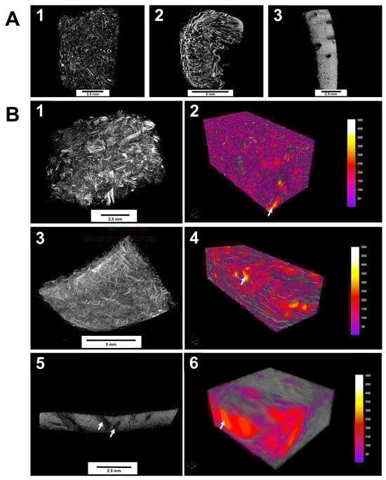 Multiple methods were used to visualize the reconstructed micro-CT images. Two-dimensional visualizations were performed using the open-source software 3D Slicer (version 5.8.1). Segmentation and subsequent porosity analyses were carried out using Bruker CTAn software (version 1.17.7.2), and the resulting segmented images were visualized with Bruker CTVox (version 3.3.0). Porosity analysis was conducted using Bruker CTAn. First, a small rectangle was defined around the scaffold boundary, and this region of interest (ROI) was exported as a series of 8-bit BMP images. ROI volumes were varied in size; to enable a comparison of measurements, the volumetric data were normalized to a constant volume of 1 mm3 before analysis. A series of filters was then applied to the image stack in CTAn for segmentation and preprocessing (filtering, thresholding via the Riddler–Calvard algorithm, and ROI shrink-wrap). Finally, 3D analyses provided porosity information in spreadsheet format and generated a 3D model for further visualization in CTVox.