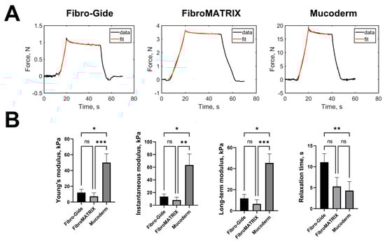 Mucoderm sponges had the highest stiffness, all modulus values were ~four times higher than those for other sponges. This is due to the presence of a dense layer of collagen above the porous layer on both sides of the sponge and overall higher material density. Fibro-Gide sponges had slightly higher values of Young’s modulus, instantaneous and long-term moduli, and relaxation time, compared to FibroMATRIX sponges (not significantly). But the relaxation time of Fibro-Gide sponges was significantly higher than such of Mucoderm sponges, which can also be due to the dense collagen layer in the latter.