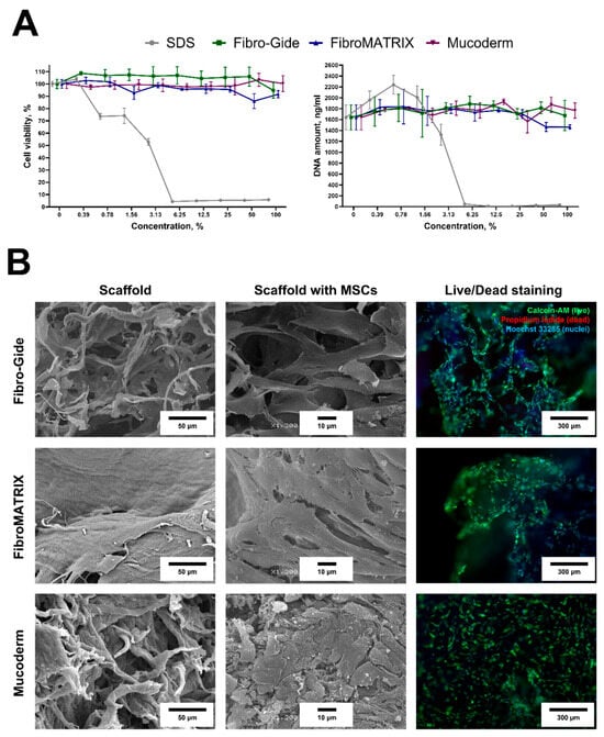 The Fibro-Gide, FibroMATRIX, and Mucoderm scaffolds were seeded with MSCs and cultured under standard conditions (37 °C, 95% humidity, 5% CO2) for three days. A live/dead assay (calcein-AM, Sigma-Aldrich, Burlington, MA, USA; propidium iodide, Thermo Fisher Scientific, Waltham, MA, USA; Hoechst 33285, Thermo Fisher Scientific, Waltham, MA, USA) was performed on the third day using a concentration of the reagents according to the manufacturer’s protocol; live cells were stained green (calcein-AM), dead cells were stained red (propidium iodide), and nuclei were additionally stained blue (Hoechst 33285). Visualization was performed using an EVOS M5000 Imaging System (Thermo Fisher Scientific, Waltham, MA, USA).