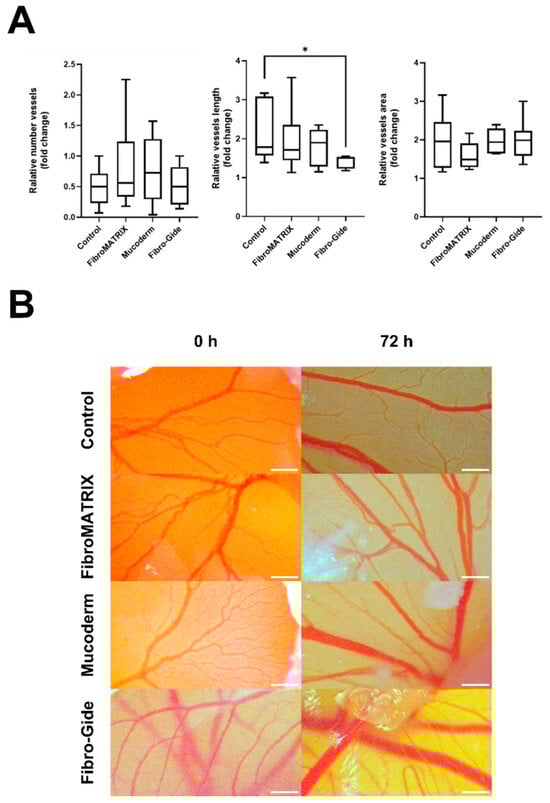Gallus gallus embryos. Seventy-two hours after implantation, no adverse effects of the FibroMATRIX and Mucoderm were observed. In embryos with Fibro-Gide, the overall vascular network length decreased 72 h after implantation compared to the control sample (