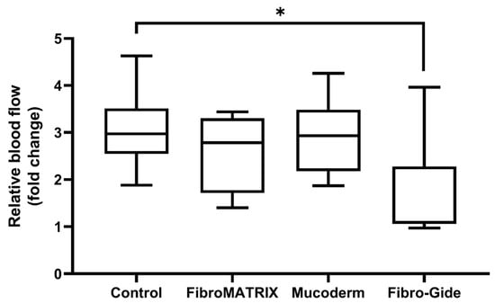 Figure 5). At the same time, the Fibro-Gide group exhibited reduced perfusion, indicating a potential negative impact of this collagen matrix on tissue vascularization. The perfusion rate in Fibro-Gide samples increased by 3.21% at 72 h post-implantation compared to the implantation day, which is 2.96 times lower than in the control group.