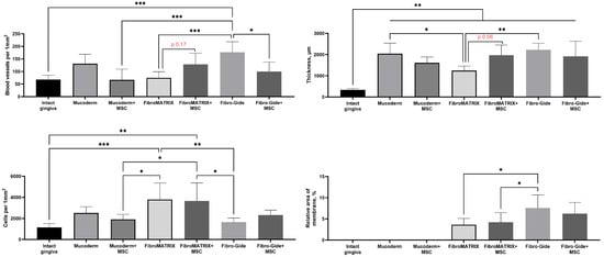 p = 0.004, respectively). No significant differences were found between the groups with and without MSCs for Mucoderm and Fibro-Gide, but a trend towards increased thickness was noted for the FibroMATRIX group with MSCs (