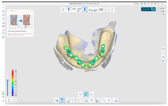Figure 2. Test group impression using Medit i900 and Medit Link (version 3.4.2., MEDIT Corp., Seoul, Republic of Korea) software, with NO SmartX tool, and one scan impression technique using Scan bodies featured with single-wing lateral extensions (SmartFlags, Apollo, Poland). Performed movements: straight and zigzag motion in anterior, straight motion in posterior.