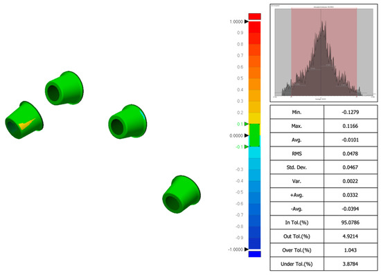 Accuracy was defined as the degree of conformity between the captured data and the actual anatomical dimensions, while precision referred to the consistency of repeated measurements. Accuracy depended on appropriate device calibration and software optimization. Comparisons between the tested groups were performed with superimposition of the files. The STL files obtained from both intraoral scanner and desktop scanners were imported into a dental CAD software (Exocad 3.1 Rijeka prototype, Exocad GmbH, Darmstadt, Germany). Scan bodies were digitally aligned with their corresponding library components to analyze factors affecting accuracy. The basal surfaces of the abutments, considered non-confidential parts of the implant system, were then exported in STL format for evaluation (Figure 2). To assess scan accuracy, dimensional deviations were quantified using the Root Mean Square (RMS) value derived from 3D superimpositions. All scan files were subsequently analyzed in Geomagic Control X (version 2022.1.0, 3D Systems, Rock Hill, SC, USA), where they were compared to the reference dataset (control group) to determine any dimensional differences (an example in Figure 3). Particularly, 3D deviation across surface meshes (STL files of planned versus actual implant positions) was compared, and a color-coded deviation map was generated. Operative time was measured as the total time in seconds required to obtain an impression. Timing began at the start of scanning and ended with either scan completion. All measurements were carried out by an experienced examiner (MQ). Geomagic software does not require direct calibration; scan-to-scan comparisons were validated using a control scan as reference (control group).