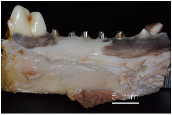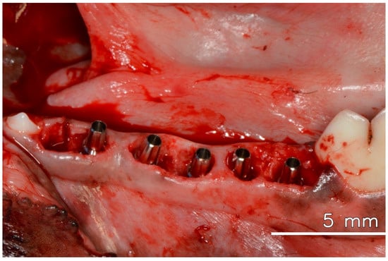 After anesthesia and preparation of the animal, three mandibular premolars were extracted. Five immediate implants, each with a diameter of 3.5 mm and a length of 10 mm, were placed in the extraction sockets and adjacent available areas, all meticulously positioned 2 mm below the bone level. All implants showed stability with an insertion torque of 45 N/cm or higher. Universal abutments (Straumann Neodent GM), with a prosthetic diameter of 3.3 mm, a transgingival height of 2.5 mm, and a prosthetic length of 6 mm, were promptly installed and torqued to 20 N/cm, following the manufacturer’s instructions, which allowed for immediate loading, even without the installation of crowns [2] (see Figure 1).