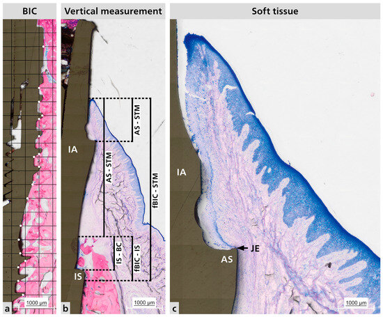 Representative histological sections. (a) Representative BIC measurement analysis. Where the white dots it is the contact between the bone and the implant surface. (b) Vertical measurements made for hard tissue and soft tissue; Distance between IS to fBIC and IS to BC; Distance between BC to STM, AS to STM, and fBIC to STM. (c) Peri-implant mucosa adaptation. BIC = bone to implant contact; IA = implant abutment; IS = implant shoulder; AS = abutment shoulder; STM = soft tissue margin; JE = junctional epithelium; fBIC = first bone to implant contact; BC = bone crest.