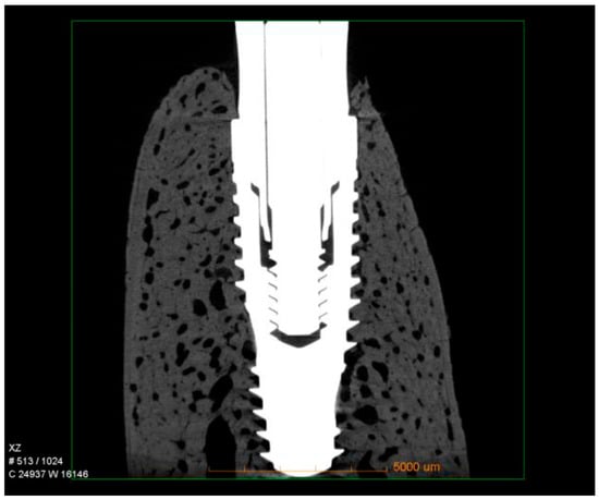 Representative micro-CT images of hybrid conical implants after 60 days of healing. The reconstructions show dense trabecular bone surrounding the implant surface, with preservation of crestal bone levels and no signs of marginal bone loss.