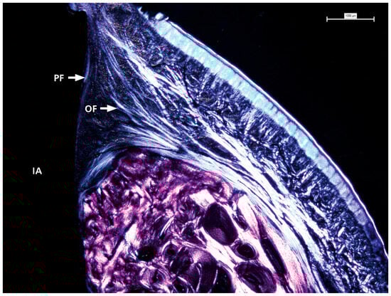 The detailed view shows the presence and distribution of collagen fibers with visible oblique and perpendicular arrangements in contact with the prosthetic abutment. IA = implant abutment; PF = perpendicular fibers; OF = oblique fibers.