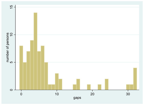 Distribution of the total number of missing teeth among all participants (n = 83). The x-axis represents the number of missing teeth (gaps) per individual (from 0 to 32), while the y-axis shows the relative frequency (proportion) of participants with each corresponding number of missing teeth.