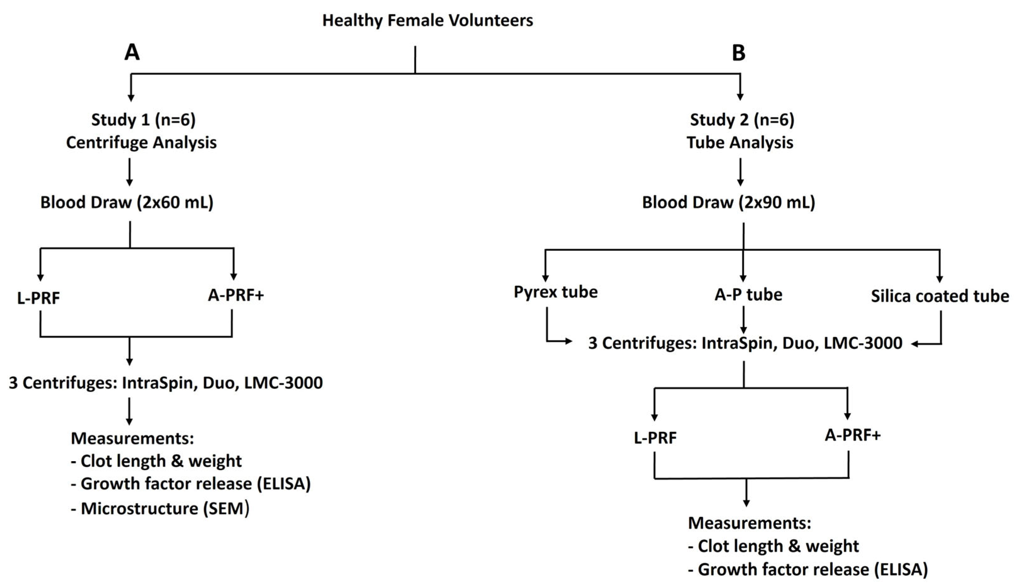 - El Bagdadi, K.; Kubesch, A.; Yu, X.; Al-Maawi, S.; Orlowska, A.; Dias, A.; Booms, P.; Dohle, E.; Sader, R.; Kirkpatrick, C.J.; et al. Reduction of Relative Centrifugal Forces Increases Growth Factor Release within Solid Platelet-Rich-Fibrin (PRF)- Based Matrices: A Proof of Concept of LSCC (Low Speed Centrifugation Concept). Eur. J. Trauma Emerg. Surg. 2019, 45, 467–479. [Google Scholar] [CrossRef]