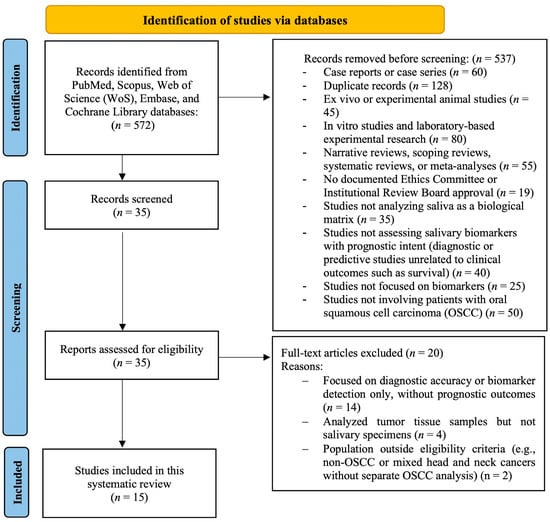 The inclusion criteria considered for this review were (I) Study design—prospective or retrospective cohort studies, case-control studies, or clinical trials specifically designed to evaluate prognostic associations between salivary biomarkers and clinical outcomes; (II) Population—human participants of any age with a histopathologically confirmed diagnosis of oral squamous cell carcinoma (OSCC); (III) Prognostic factor—salivary biomarkers of proteomic, transcriptomic, or metabolomic origin investigated for their association with patient prognosis; (IV) Outcome—reported data on associations between salivary biomarkers and at least one predefined prognostic endpoint, including TNM stage, histopathological grade, lymph node involvement, local or distant recurrence, disease progression, disease-free survival (DFS), or overall survival (OS); (V) Timing—prognostic outcomes evaluated during treatment, after treatment completion, or at follow-up time points such as 6 months, 1 year, or longer; (VI) Setting—no restrictions regarding clinical setting or geographic location; (VII) Language and publication date—no restrictions on language or date of publication.