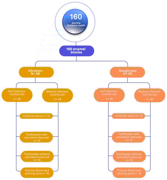 A total of 160 enamel blocks were assigned, of which 80 were used for abrasion analysis and 80 for roughness study. Both procedures were performed independently and simultaneously, as detailed below (Figure 1).