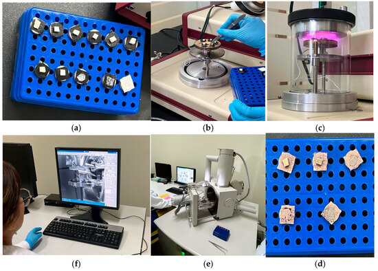 SEM setup. Flow chart for SEM image preparation of bovine dental samples: (a) mounting on stub, sample holder with conductive adhesive; (b) placement of samples on metallization base; (c) gold sputtering, application of metallic coating by sputtering; (d) review of correctly metallized samples; (e) SEM imaging, insertion into SEM chamber for visualization under vacuum; and (f) acquisition and analysis, digital image capture for morphological analysis.