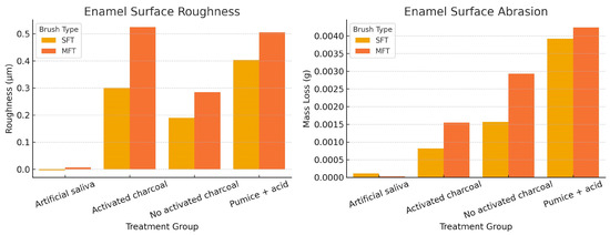 Comparison of enamel surface roughness (µm) and abrasion (g) after brushing cycles with soft (SFT) and medium (MFT) bristles, using toothpaste with and without activated charcoal. Greater roughness and abrasion are observed in the groups treated with activated charcoal toothpaste, especially with medium-bristle brushes.