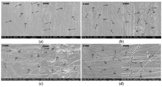 SEM micrographs of the surface of bovine enamel at 1000× and 5000× magnification are presented in Figure 4. In Figure 4a (1000×), the uniform prismatic enamel is observed without any intervention, with imbrication lines (IL), perichematite ridges (PR), vertical striations of different depths (SD), and surface deposit particles (DP). At 5000×, the prismatic enamel showed remarkable variation, with imbrication lines (IL), striations of different depths (SD), and superficial deposits (DP).