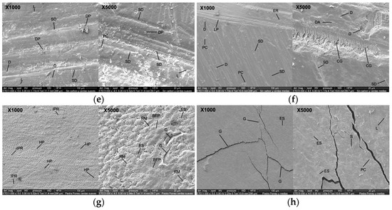 In Figure 4h (1000×), the enamel is observed after the brushing cycle with pumice and etching acid using medium-filament brushes. The enamel prisms are almost completely removed; the prism sheath is poorly defined (ES) and shows some cracks and fractures (G). At 5000×, the prismatic surface of the enamel was observed with fish scale appearance (S), widening of the prism sheaths (ES), crater-like depressions (PC), and pits forming linear depressions (L).