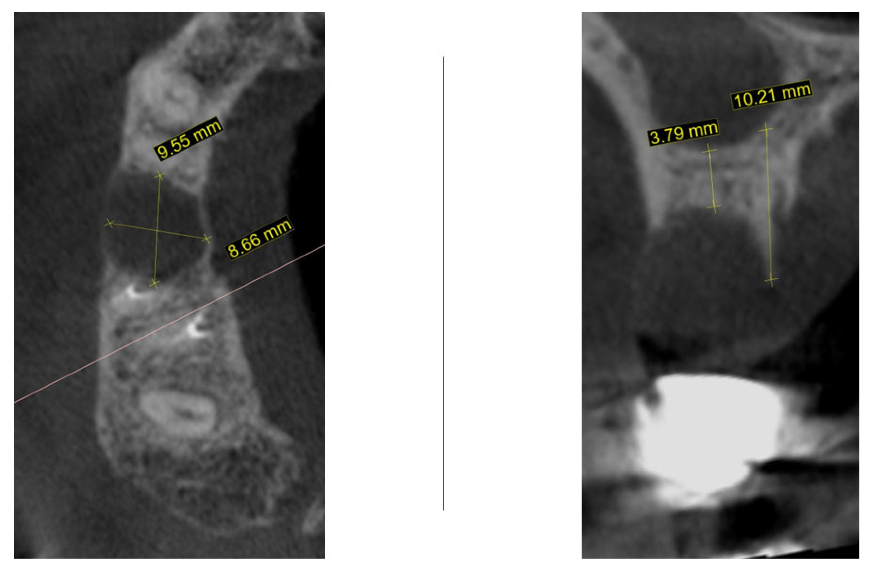 - Mesio-distal width of the crestal mucosa (to the adjacent teeth)—∅ of the implant + min 3 mm;