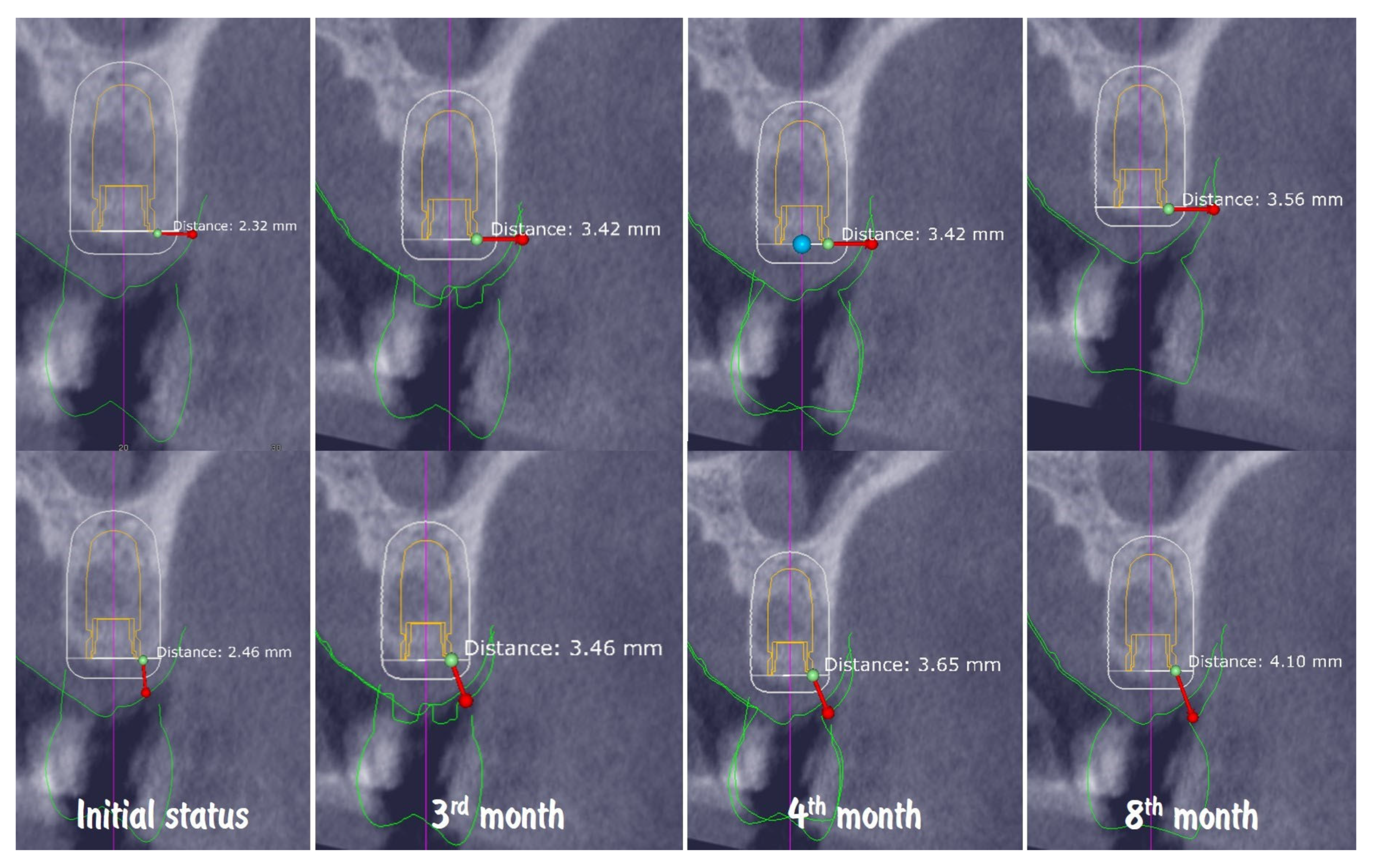 | 5 | 8 months post-op (final crown) | 3.5 | 4.1 | Final crown placed, harmonious soft tissue contours, and stable crestal bone |