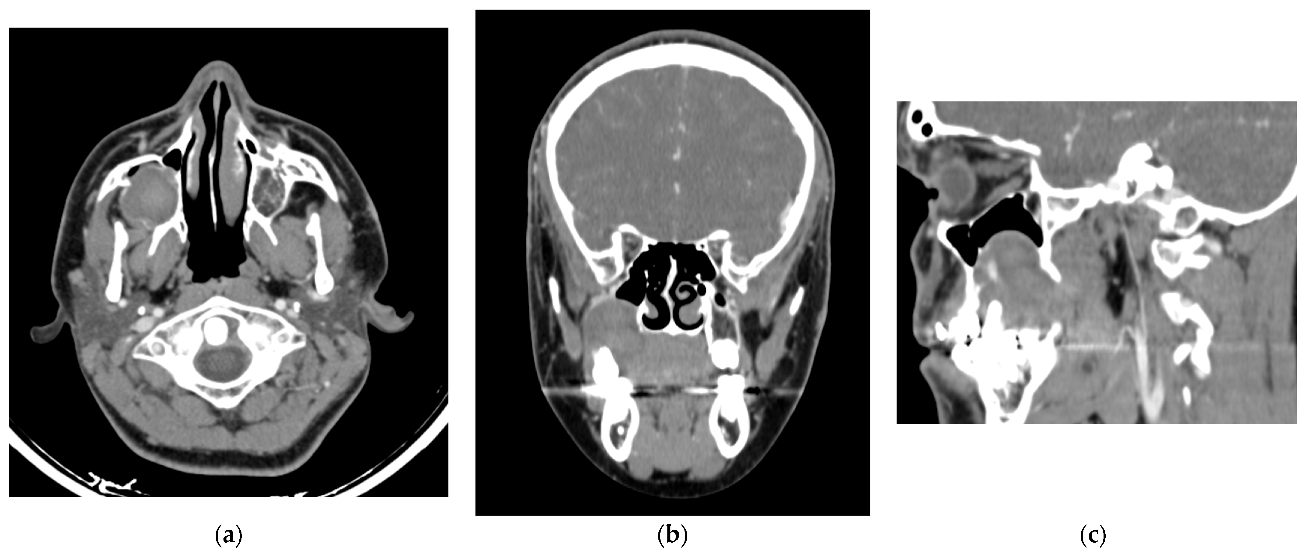 - Kawahara, F.; Shirayama, R.; Ito, T.; Oshida, K.; Sato, T.; Kusuhara, K. Hemophilic pseudotumor of the maxillary sinus in an inhibitor-positive patient with hemophilia A receiving emicizumab: A case report. Int. J. Hematol. 2022, 115, 906–912. [Google Scholar] [CrossRef] [PubMed]