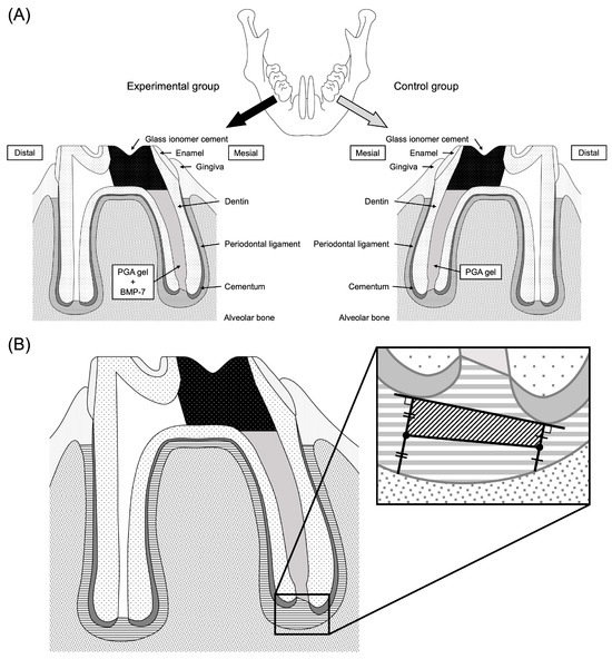 Each rat was anesthetized with isoflurane (FUJIFILM Wako Pure Chemical Corp.) and a triple anesthetic mixture of medetomidine (Domitor; Nippon Zenyaku Kogyo Co., Ltd., Fukushima, Japan), midazolam (Midazolam Sandoz; Sandoz, Yamagata, Japan) and butorphanol (Vetorphale; Meiji Seika Pharma Co., Ltd., Tokyo, Japan). After local anesthesia with lidocaine (Epilido cartridge; Nipro Co., Osaka, Japan), a rubber-dam isolation technique was performed using a custom-made rubber-dam clamp for rats (YDM Co., Tokyo, Japan) and a rubber-dam sheet. In addition, a caulking material (Dentto-Dam; Mediclus Co., Ltd., Cheongju, Republic of Korea) was applied to the gaps between the clamps and sheets to accomplish complete isolation. A cavity was then prepared on the occlusal surface of the mandibular first molar of each rat using a 0.5 mm carbide bur (Shofu carbide round bur No. 1/4; Shofu, Kyoto, Japan) and the coronal pulp was removed using a micro-excavator (OK Micro-exca; Seto, Ibaraki, Japan) under a surgical loupe (Admetec Solutions Ltd., Haifa, Israel) and a stereoscopic microscope (Stemi 508; Carl Zeiss, Oberkochen, Germany). The root canal length of the mesial root was measured using an electrical root canal length measuring device (Root ZX; J. Morita Corp., Tokyo, Japan) and the working length was set at 3.5 mm, which is the root canal length (4 mm) - 0.5 mm. The mesial root canal was enlarged with a nickel-titanium rotary file (ProTaper Gold SX; Dentsply Sirona, Tokyo, Japan) in the coronal root canal. After penetrating the root canal with a #8 K file, an apical root canal was prepared with 0.04 taper nickel-titanium rotary files (Race; FKG, La Chaux-de-Fonds, Switzerland) from #10 to #20 at the working length. Each root canal was irrigated with 10% sodium hypochlorite (Neo Cleaner “Sekine”; Neo Dental Chemical Products, Tokyo, Japan) and 17% ethylenediaminetetraacetic acid (EDTA; Ci Medical Co., Ltd., Ishikawa, Japan) by passive ultrasonic irrigation (#20 U-file; Zipperer Co., München, Germany). The concentration of 10% sodium hypochlorite was selected to reproduce the clinical conditions used in our college hospital, where this concentration is routinely employed for endodontic irrigation. After the root canal was rinsed with purified water and wiped with absorbent paper, the root canal on the left side was filled with 1% PGA as the control group, and the root canal on the right side was filled with 1% PGA containing 50 μg/mL BMP-7 as the experimental group. The coronal access cavities were then sealed with a light-curing glass ionomer cement (Ionosit-Baseliner; DMG, Chemisch-Pharmazeutische Fabrik GmbH, Hamburg, Germany). The occlusal surfaces were then adjusted to avoid occlusion with the opposing teeth (Figure 1A).