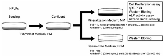 Overview of HPLFs used in the in vitro studies. HPLFs were cultured in FM. MM was used for experiments with BMP-7 at concentrations of 0, 100 or 200 ng/mL. SFM was used for experiments with BMP-7 at 0 or 100 ng/mL and LDN-193189 at 0, 1, 10, 100 or 1000 nM. FM; fibroblast medium, MM; mineralization medium, SFM; serum-free medium.