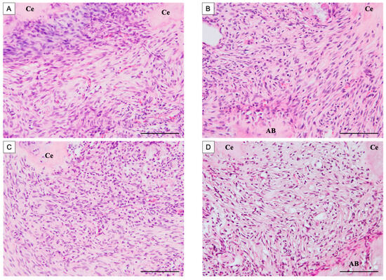 H-E stained images of the apical area of the mesial root after root canal treatment. The control group was filled with PGA only, and the experimental group was filled with PGA and 50 µg/mL BMP-7. (A) Control group at 14 days postoperatively. (B) BMP-7 group at 14 days postoperatively. (C) Control group at 28 days postoperatively. (D) BMP-7 group at 28 days postoperatively. (n = 5) In all groups, the periodontal ligament at the root apex was mainly composed of short spindle-shaped cells, and no continuous formation of cementum along the root surface was observed. Scale bars = 100 μm. Ce: cementum, AB: alveolar bone.