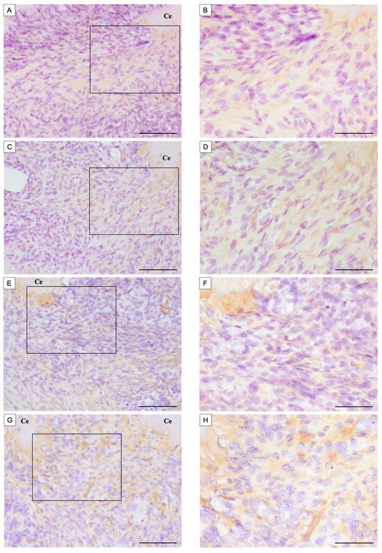 Paraffin sections of specimens at days 14 and 28 after treatment were used for immunohistochemical observations. The paraffin sections were deparaffinized with xylol and were antigen-activated for 20 min at 37 °C with a Trypsin Antigen Retrieval Kit (ab259256, Abcam, Cambridge, MA, USA). Each section was immersed in methanol containing 0.3% hydrogen peroxide solution at room temperature to block endogenous peroxidase activity. The sections were blocked with 10% goat serum for 30 min at room temperature to reduce non-specific binding. Sections were then reacted with the primary antibody at 4 °C overnight. The primary antibody used was a rabbit anti-F-spondin antibody (Spon1; 1:100, ab215165, Abcam) as a cementoblast marker. The primary antibody was replaced with 1% goat serum as a negative control. The sections were then reacted with Mach 2 rabbit HRP-polymer secondary antibody (BRR522G, Biocare Medical, Concord, CA, USA) for 30 min at room temperature, after which the sections were stained with DAB and nuclei were stained with hematoxylin.
