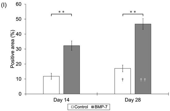 Spon1-positive reactions were visible around the root cementum in all groups. At 14 days after root canal treatment, a few Spon1-positive areas were observed at the root apex in the control group (Figure 4A,B). More Spon1-positive areas were observed in the BMP-7-treated experimental group at 14 days compared to the control group (Figure 4C,D). On the other hand, at 28 days after root canal treatment, the control group showed a greater extent of Spon1-positive areas than at day 14 (Figure 4E,F). Most Spon1-positive areas were observed in the root apex in the BMP-7-treated experimental group at 28 days compared to the control group (Figure 4G,H). The ratio of the Spon1-positive area to the area of interest was 11.8 ± 2.02% for the control group and 32.3 ± 3.14% for the BMP-7-treated experimental group on postoperative day 14, and 17.0 ± 2.25% for the control group and 46.7 ± 3.60% for the BMP-7-treated experimental group on postoperative day 28 (Figure 4I). Spon1 positivity was significantly higher in the BMP-7-treated experimental group compared to the control group on both postoperative days 14 and 28. Furthermore, Spon1 positivity was significantly increased on day 28 compared to day 14 in both groups.
