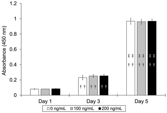 Cell proliferation rate of HPLFs cultured with different BMP-7 concentrations. Significant increases in cell proliferation were observed in all groups from Day 1 to Day 5, but no significant differences were found among the concentrations. (n = 4) Daggers indicate significant differences compared with Day 1, and double daggers indicate significant differences compared with Day 3 (††: p < 0.01 vs. Day 1; ‡‡: p < 0.01 vs. Day 3).