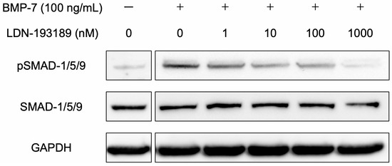 The expression of SMAD-1/5/9 was qualitatively detected in all groups (Figure 6). The expression of phospho-SMAD-1/5/9 was qualitatively observed after treatment with 100 ng/mL BMP-7, but its band intensity decreased as the concentration of the BMP-7 inhibitor LDN-193189 increased. These findings were based on qualitative evaluation of band intensity rather than quantitative densitometric analysis. Additional data, including the densitometric analysis (Table S1) and uncropped Western blot images (Figure S1), are provided in the Supplementary Materials (File S1).