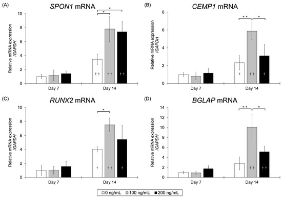 mRNA expression levels at each BMP-7 concentration assessed by qRT-PCR analysis. The expression levels of each mRNA were higher in the 100 ng/mL BMP-7-treated group compared to the control group. (A) SPON1 mRNA expression levels. (B) CEMP1 mRNA expression levels. (C) RUNX2 mRNA expression levels. (D) BGLAP mRNA expression levels. (n = 4) Asterisks indicate significant differences among BMP-7 concentrations on the same day (*: p < 0.05, **: p < 0.01), whereas daggers indicate significant differences between Day 7 and Day 14 within the same BMP-7 concentration (†: p < 0.05, ††: p < 0.01).
