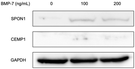 The SPON1 protein was qualitatively detected with the strongest expression in the 100 ng/mL BMP-7-treated group, followed by the 200 ng/mL BMP-7-treated group, whereas its expression in the control group was minimal (Figure 8). Similarly, CEMP1 protein expression was qualitatively observed in the 100 ng/mL BMP-7-treated group and only slightly in the 200 ng/mL BMP-7-treated group, but was not detected in the control. These findings were based on qualitative evaluation of band intensity rather than quantitative densitometric analysis. Additional data, including the densitometric analysis (Table S2) and uncropped Western blot images (Figure S2), are provided in the Supplementary Materials (File S1).