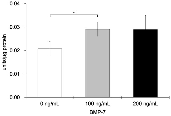 ALP activity of HPLFs following treatment at each BMP-7 concentration. ALP activity was significantly higher in the 100 ng/mL BMP-7-treated group compared to the control group (n = 6) (*: p < 0.05).