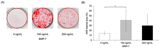 After 28 days of incubation of HPLFs in MM, calcium deposition was qualitatively observed to increase in the BMP-7-treated groups (Figure 10A). To semi-quantitatively evaluate mineralization, the stained area was measured. The calcified area (mean ± SD) was 14.09 ± 3.78, 40.84 ± 22.65, and 29.89 ± 23.43 for the 0, 100, and 200 ng/mL BMP-7-treated groups, respectively. In particular, the area of calcified nodules was significantly increased in the 100 ng/mL BMP-7-treated group compared to the control group (p < 0.05) (Figure 10B).