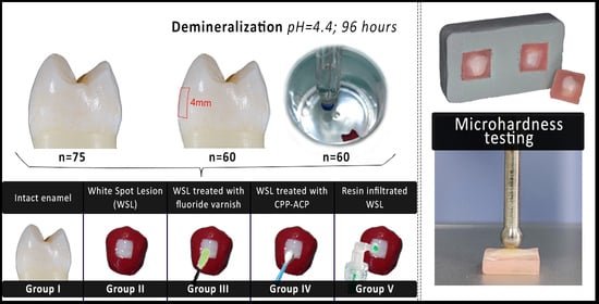 - Paris, S.; Schwendicke, F.; Seddig, S.; Muller, W.D.; Dorfer, C.; Meyer-Lueckel, H. Micro-hardness and mineral loss of enamel lesions after infiltration with various resins: Influence of infiltrant composition and application frequency in vitro. J. Dent. 2013, 41, 543–548. [Google Scholar] [CrossRef]