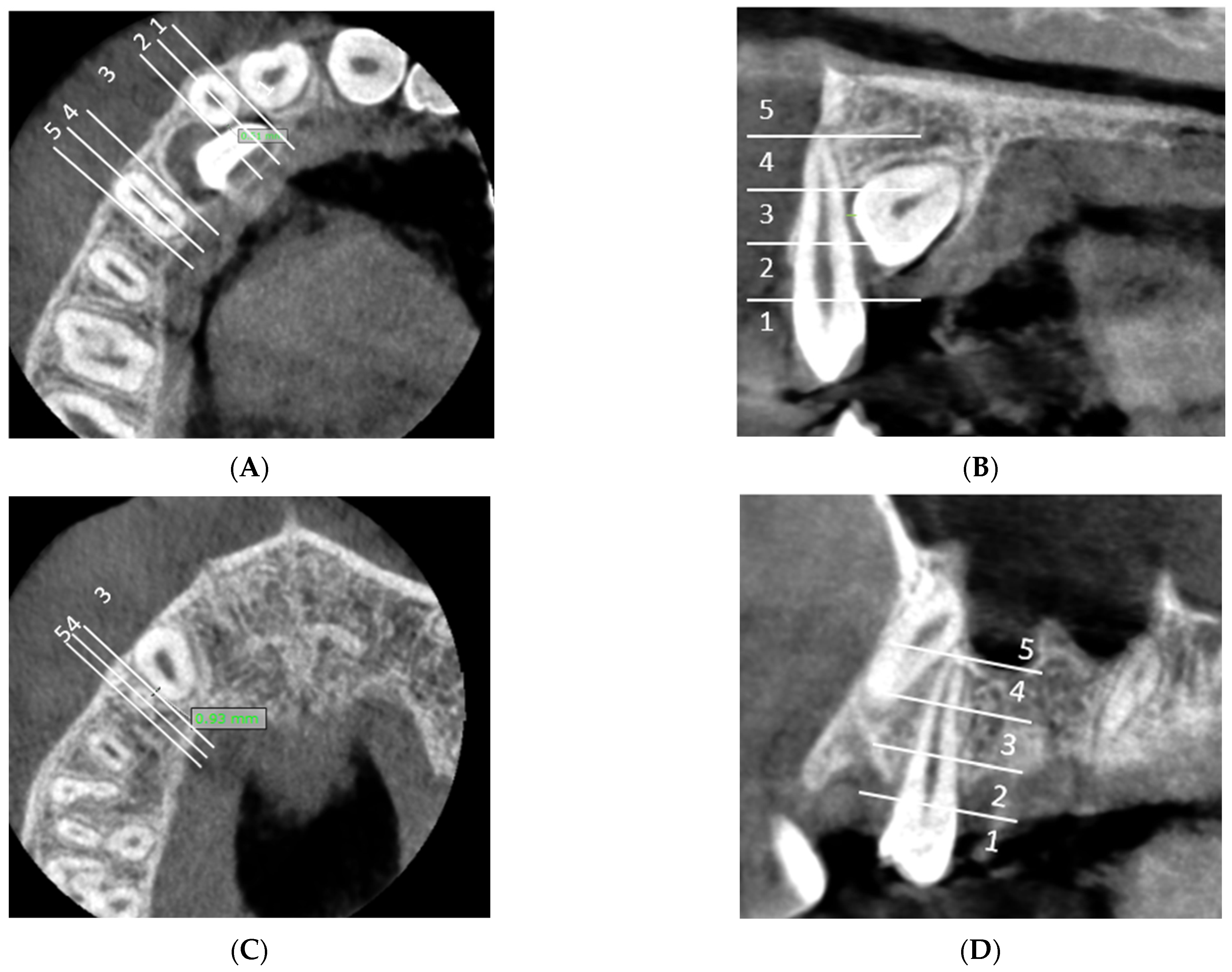2.2. CBCT Evaluation (Figure 2, Figure 3 and Figure 4)