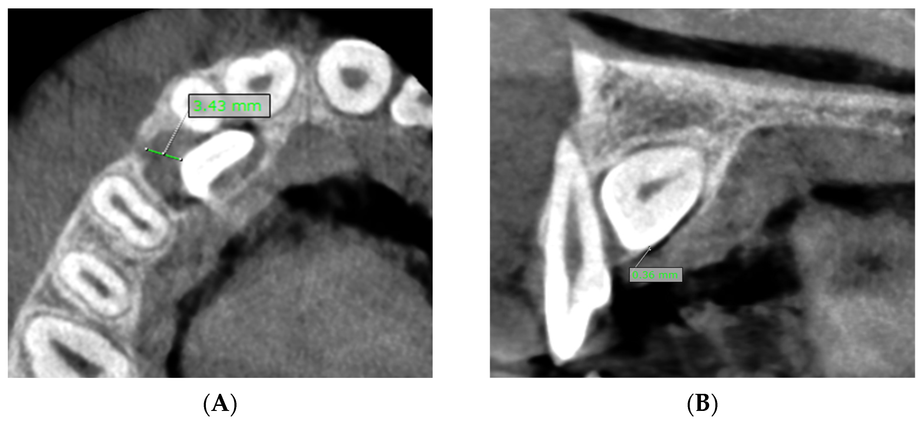Figure 4. (A) Measurement of the maximal follicle size of the impacted maxillary canine. (B) Measurement of the shortest distance between the impacted canine/dental follicle and the external cortical bone margin. The minimal distance between the dental follicle and the external cortical bone margin is 0 mm and the minimal distance between the impacted canine and the external cortical bone margin is 0.36 mm.